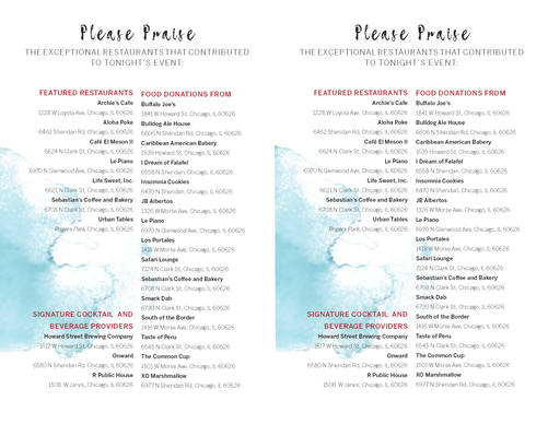 Both years focus on highlighting new upcoming food businesses in the Rogers Park area at the same time financially benefitting RPBA. For 2020 specifically, although I created most of the marketing collateral, I was also in charge of inviting and coordinating all the savory restaurants coming to the event. Here are more details. I would have managed the 2020 event; however, unfortunately, COVID-19 occurred where we canceled the event due to the safety of all.